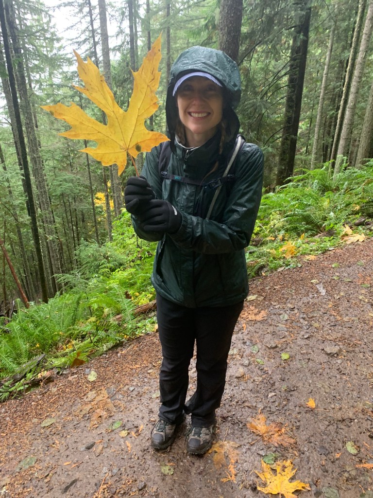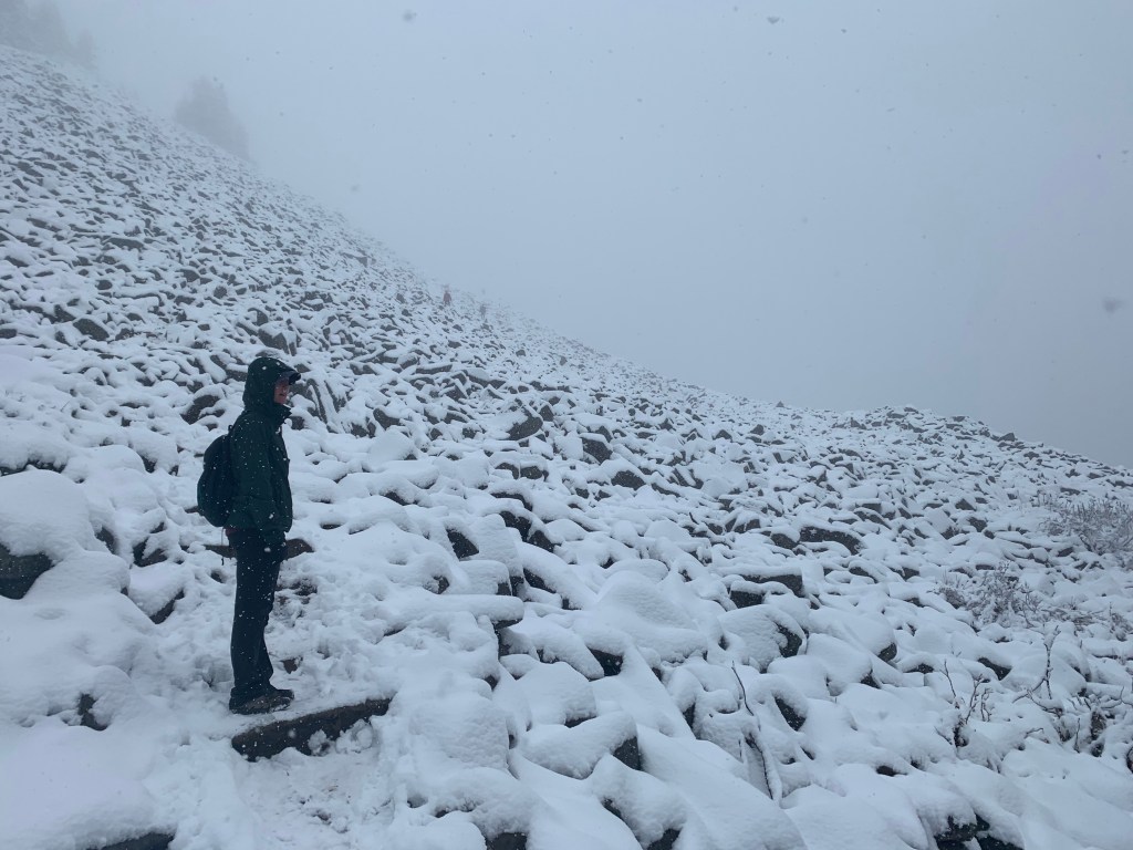 I was expecting an 8 mile round trip that was challenging, but totally doable. Ha… boy was I mistaken. This ended up being closer to a 12 mile round trip with an elevation change of 4800 feet starting and ending in the rain… the only break in the rain was the blizzard conditions at the top to get to the frozen mailbox….