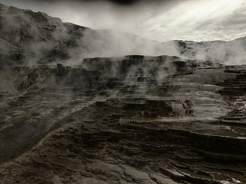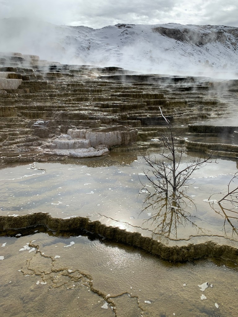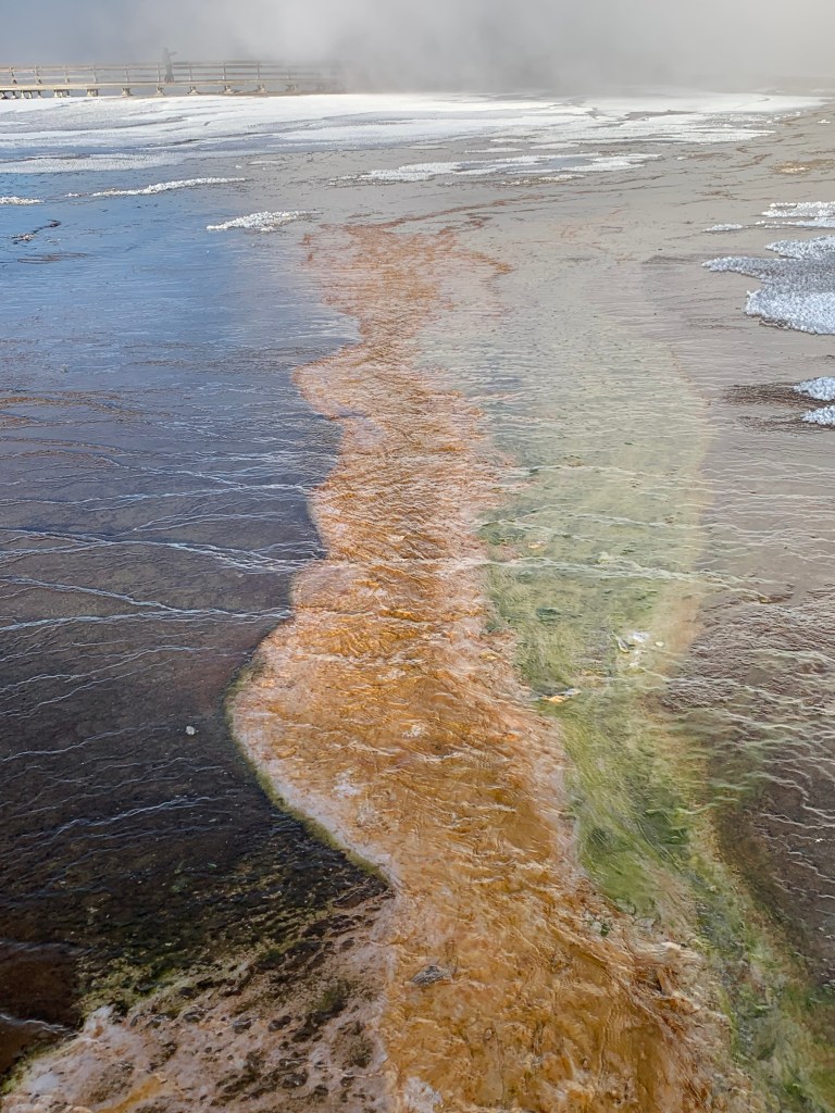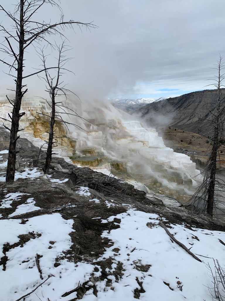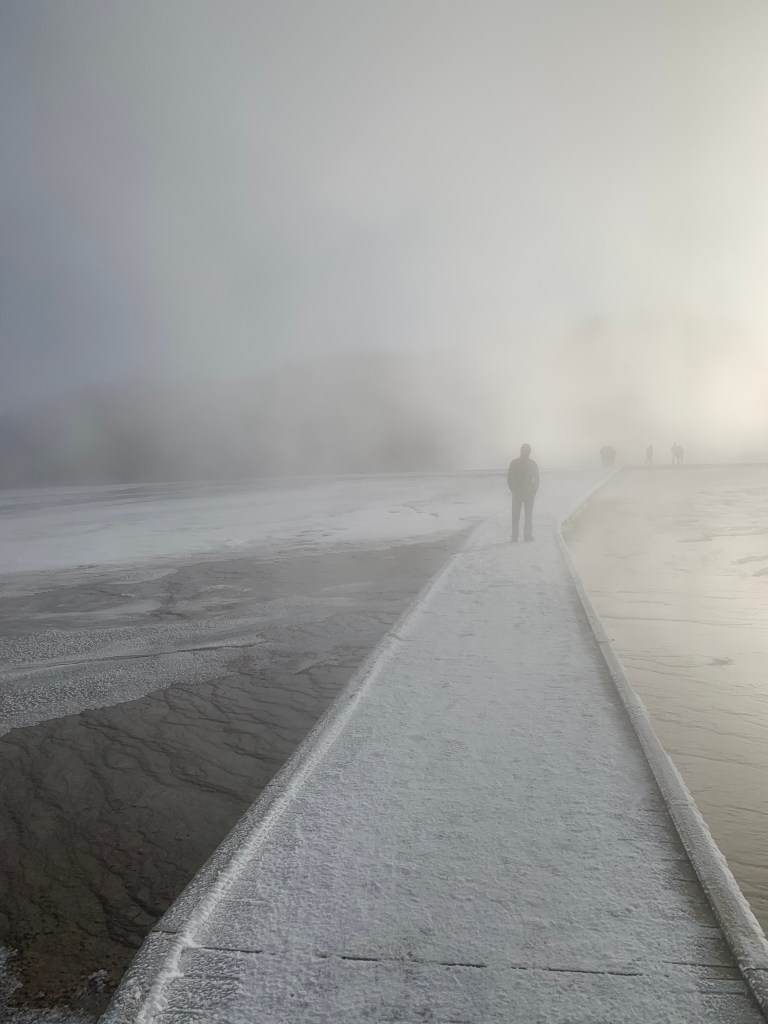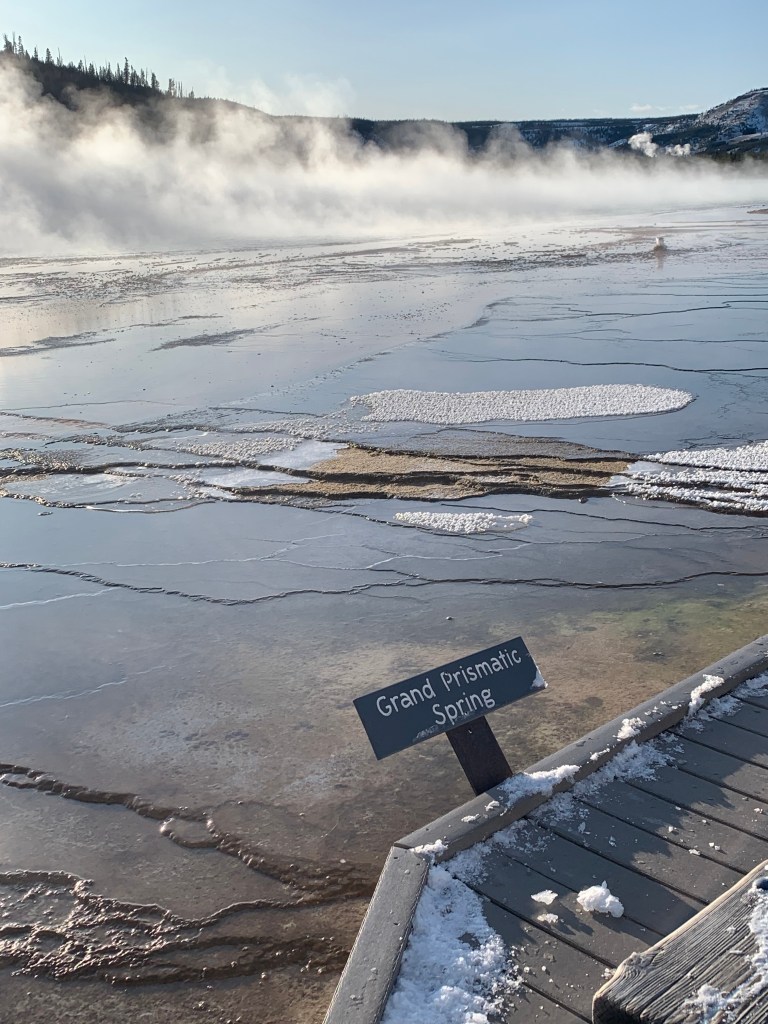 After being on the road ALL day to say the least, we made a quick pitstop at The Grand Prismatic Spring and did a brisk walk around in the thick steam! The steam coming off the spring mixing with the frigid air made it hard to see much and we were too busy anyway trying to not slip on the snow/ice on the narrow walkway and fall in!