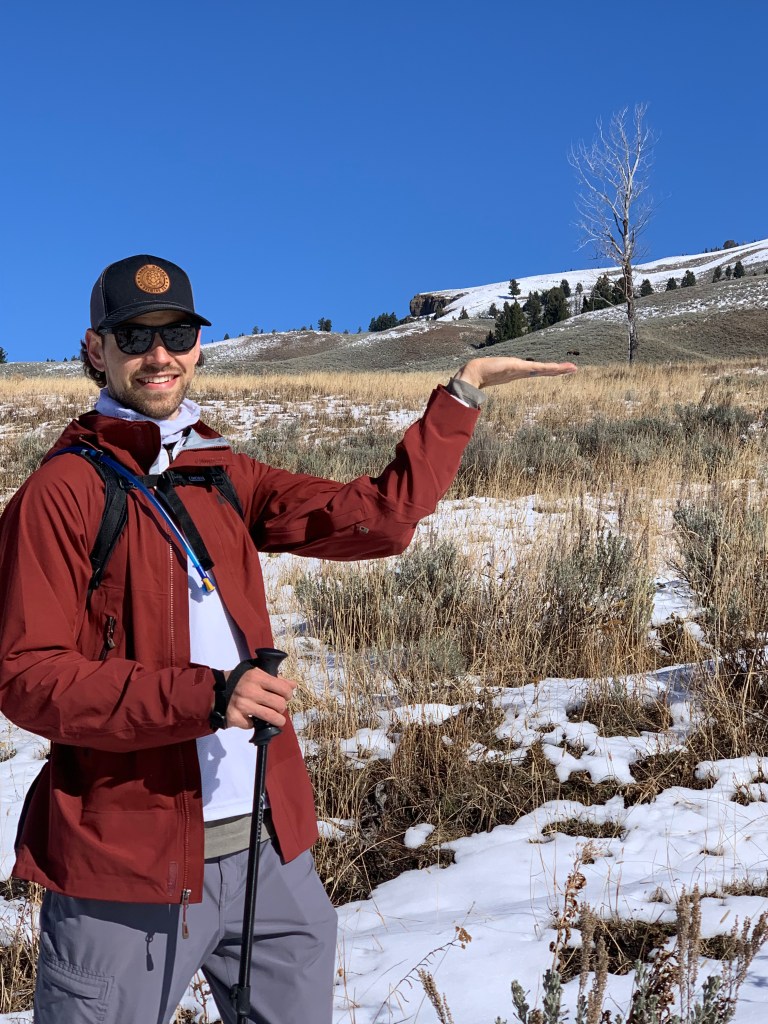 The next day plans to see the Grand Canyon of Yellow Stone and take on a bit longer of a hike were thwarted due to weather… the roads and trails were closed… so we enjoyed venturing over to Lamar Valley instead. We found ALL the bison, having to stop more than once to let the herds pass along the road. Lamar Valley was different than our usual hikes since it was not to a specific peak or destination, more a long nature walk, but we did spot a few bison roaming the surrounding hillsides so Josh just HAD to hold one in his hand ha! By mid afternoon, the sun melting the snow on our way back made for an interesting slip-n-slide type trek back to the truck… not to mention the bison head we saw along the way… yikes!